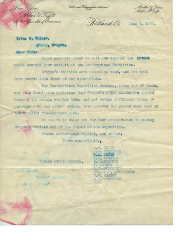 Letter awarding Cyrus Walker a diploma and medal for his exhibit in the Pan-American Exposition