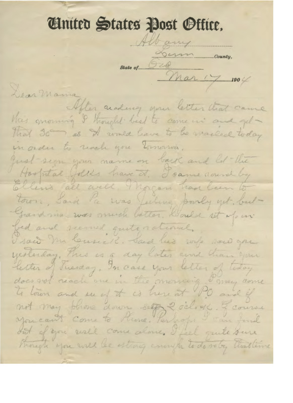Letter from Cyrus Walker to his wife sending her money