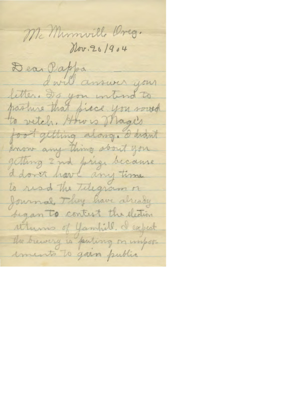Cyrus Walker was the oldest son of the early Oregon Territory missionaries Elkanah and Mary Richardson Walker. He grew up at Tshimakain in the 1830s-40s, where he learned the native Spokane language. After joining the U.S. army during the Civil War and then attempting to make a living as a farmer, he became a teacher at the Warm Springs Indian Agency. These letters, documents and clippings shed light on his experiences as a missionary, a soldier, a pioneer and a teacher at Warm Springs. This collection was donated to Pacific University by Betty Thorne, a descendant of the Walkers.