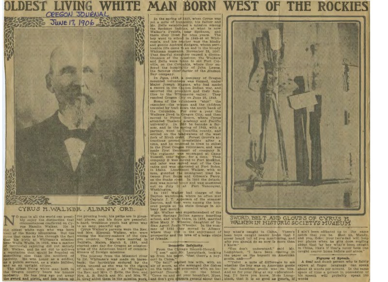 'Oldest Living White Man Born West of the Rockies' news article in the Oregon Journal on Cyrus Walker