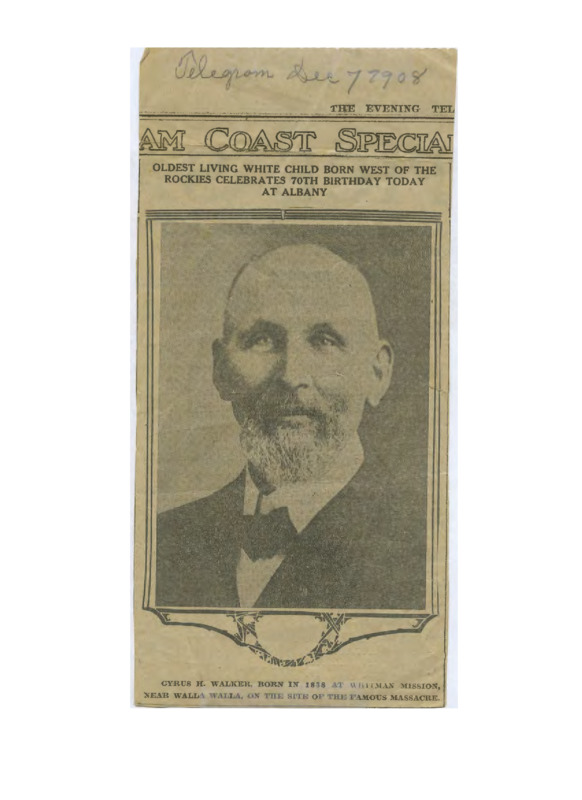 Cyrus Walker was the oldest son of the early Oregon Territory missionaries Elkanah and Mary Richardson Walker. He grew up at Tshimakain in the 1830s-40s, where he learned the native Spokane language. After joining the U.S. army during the Civil War and then attempting to make a living as a farmer, he became a teacher at the Warm Springs Indian Agency. These letters, documents and clippings shed light on his experiences as a missionary, a soldier, a pioneer and a teacher at Warm Springs. This collection was donated to Pacific University by Betty Thorne, a descendant of the Walkers.