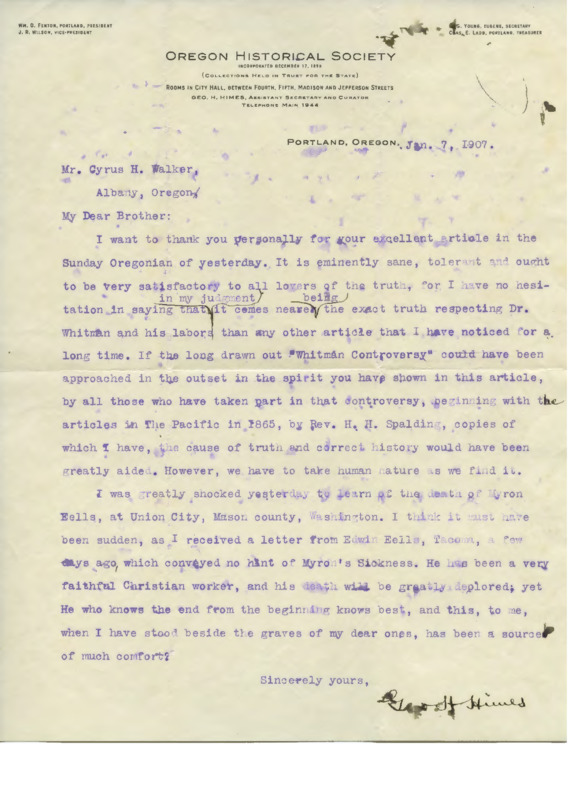 Letter from George Himes to Cyrus Walker on an article by Walker and the death of Myron Eells