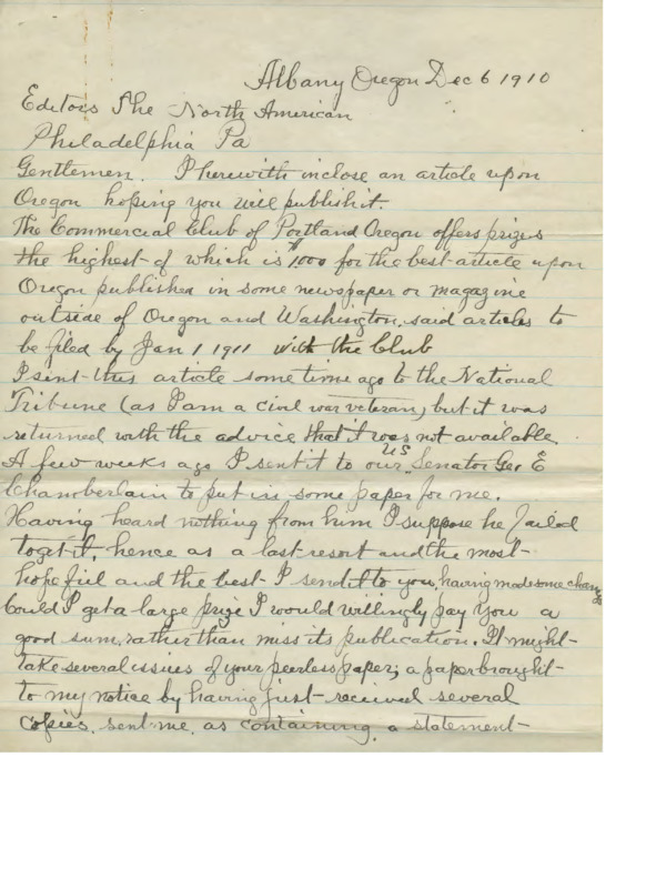 Letter from Cyrus Walker to the editors of The North American asking them to publish an article on Oregon