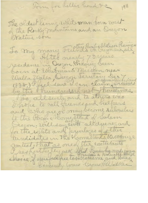 Campaign letter to Cyrus Walker's friends asking them to vote for him in the Homesteads $10,000 Prize Contest
