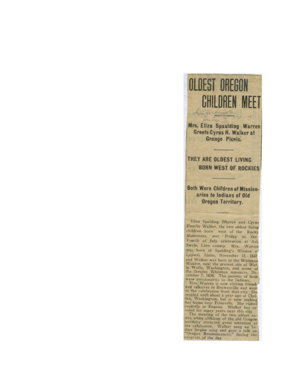 'Oldest Oregon Children Meet' news article in the Democrat on a meeting between Cyrus Walker and Eliza Spalding Warren
