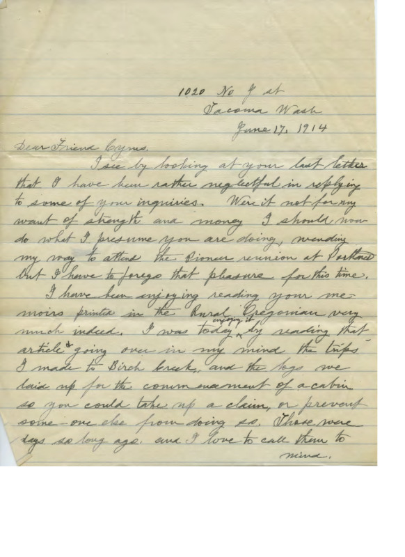 Letter from Edwin Eells to Cyrus Walker reminiscing on the past
