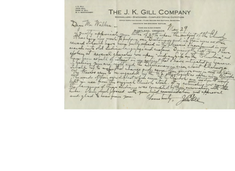 Letter from John Gill to Cyrus Walker thanking him for a correction made to a dictionary entry on the Chinook Tribe