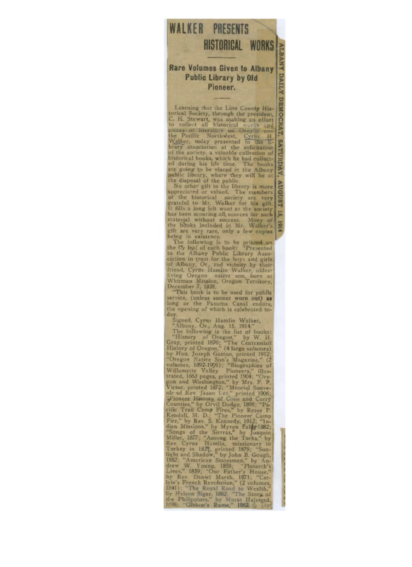 'Walker Presents Historical Works' news article in The Albany Democrat on Cyrus Walker's book donation to the Albany Public Library