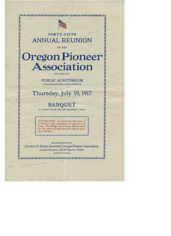 Program from the Oregon Pioneer Association public auditorium and banquet