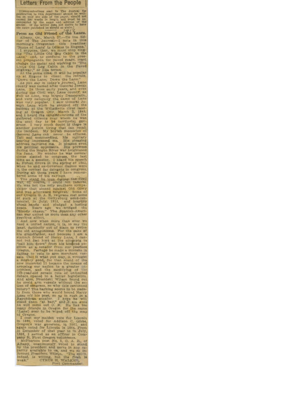 'From an Old Friend of the Lanes' news article in The Journal by Cyrus Walker in defense of General Joseph Lane