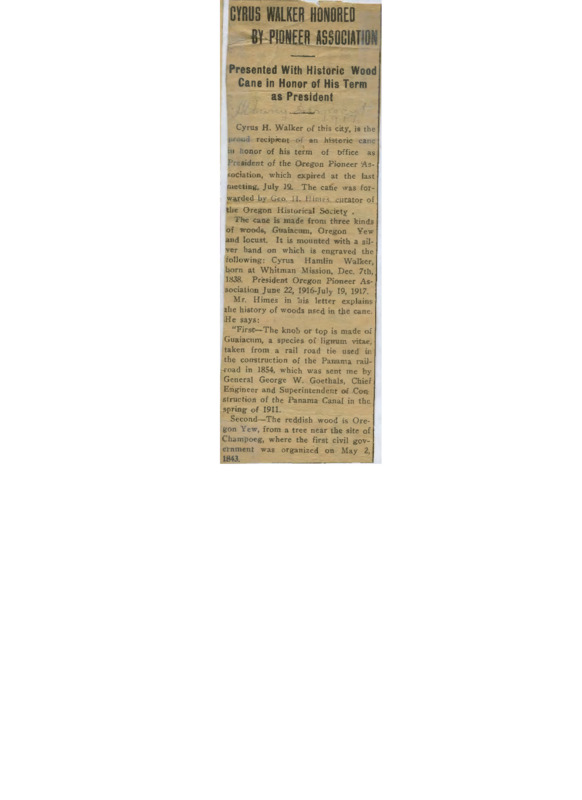 'Cyrus Walker Honored By Pioneer Association' news article in the Albany Democrat