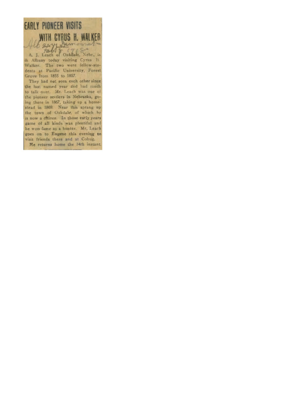 'Early Pioneer Visits With Cyrus H. Walker' news article in the Albany Democrat on A. J. Leach's visit with Cyrus Walker