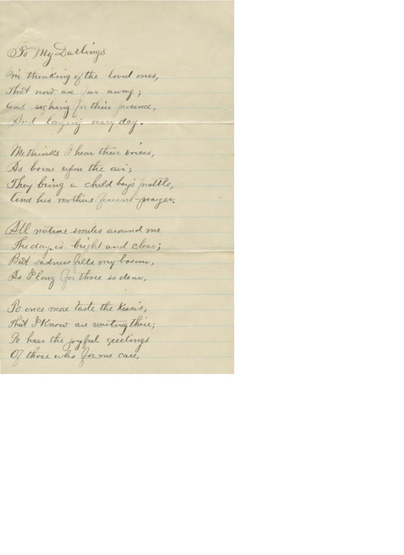 A letter from Cyrus Walker to his wife, Mary Wheeler Walker. At the time, Cyrus was a clerk at the Warm Springs Indian Agency, and his wife and their child were living temporarily in another county. The letter describes some house renovations and also the departure of the Agency doctor, "Dr. S." Cyrus Walker was the oldest son of the early Oregon Territory missionaries Elkanah and Mary Richardson Walker. He grew up at Tshimakain in the 1830s-40s, where he learned the native Spokane language. After joining the U.S. army during the Civil War and then attempting to make a living as a farmer, he became a teacher at the Warm Springs Indian Agency. These letters, documents and clippings shed light on his experiences as a missionary, a soldier, a pioneer and a teacher at Warm Springs. This collection was donated to Pacific University by Betty Thorne, a descendant of the Walkers.