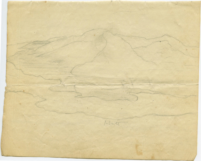 Drawing by Pherne Brown Pringle, the daughter of Tabitha Moffatt Brown, the 'Mother of Oregon.' This sketch features a view of the Platte River in Nebraska during her family's journey on the Oregon Trail. Copies of later drawings were accompanied in an album by journal entries of Pherne's husband, Virgil K. Pringle.