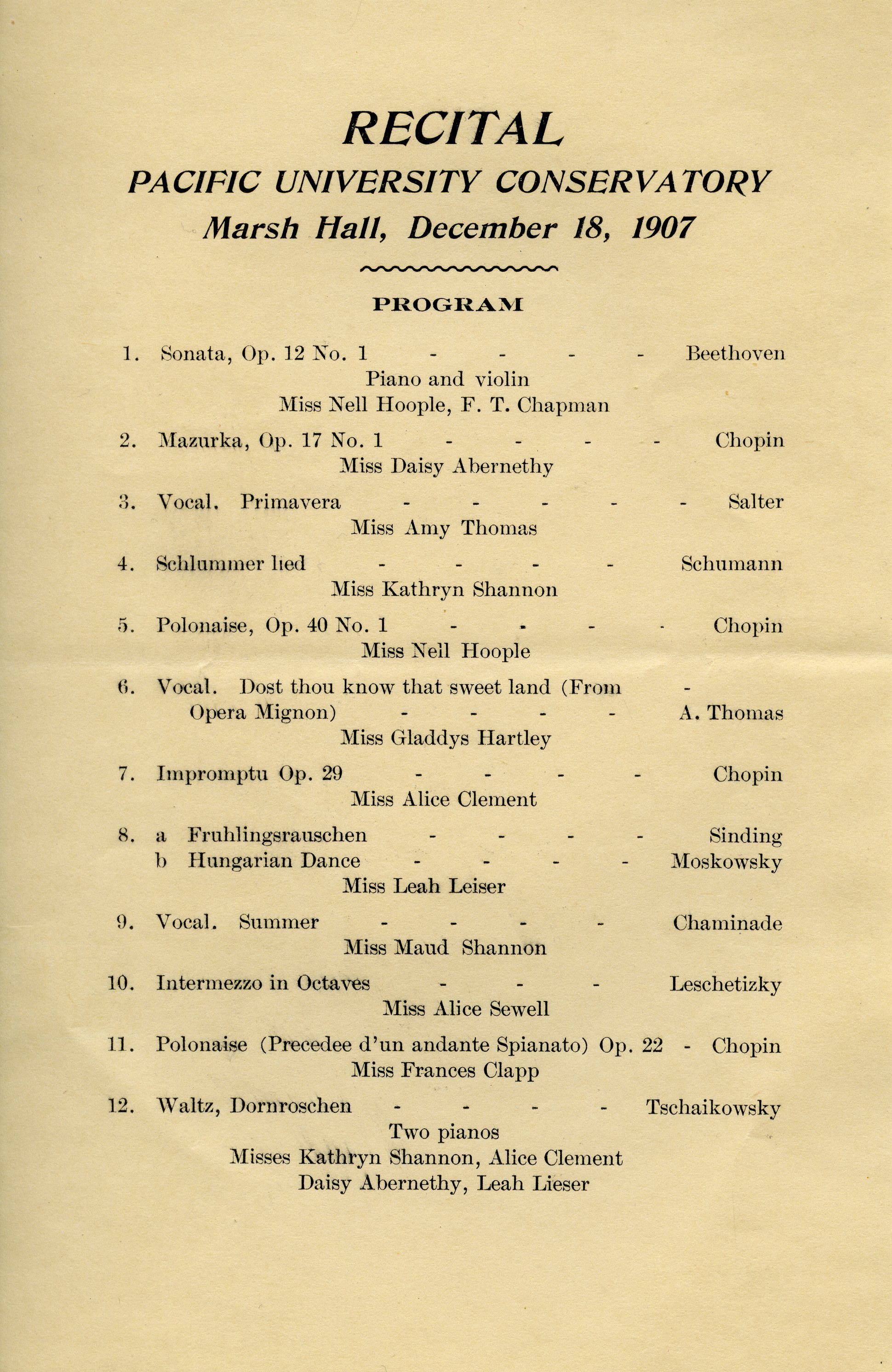 A program for the Pacific University Conservatory of Music's recital held on December 18th, 1907 in Marsh Hall. The students that performed are listed as Nell Hoople, F.T. Chapman, Daisy Abernethy, Amy Thomas, Kathryn Shannon, Gladdys Hartley, Alice Clement, Leah Leiser, Maud Shannon, Alice Sewell and France B. Clapp. This recital program appears in a scrapbook album compiled by Clapp, a 1908 Pacific University graduate.