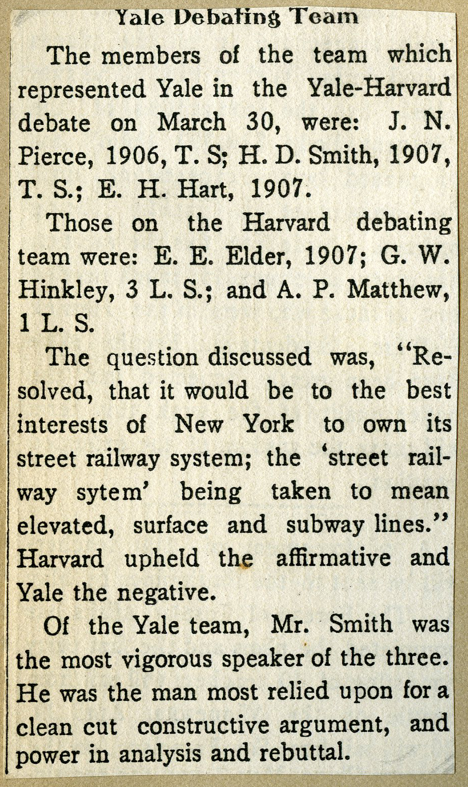 'Yale Debating Team' Newspaper Article
