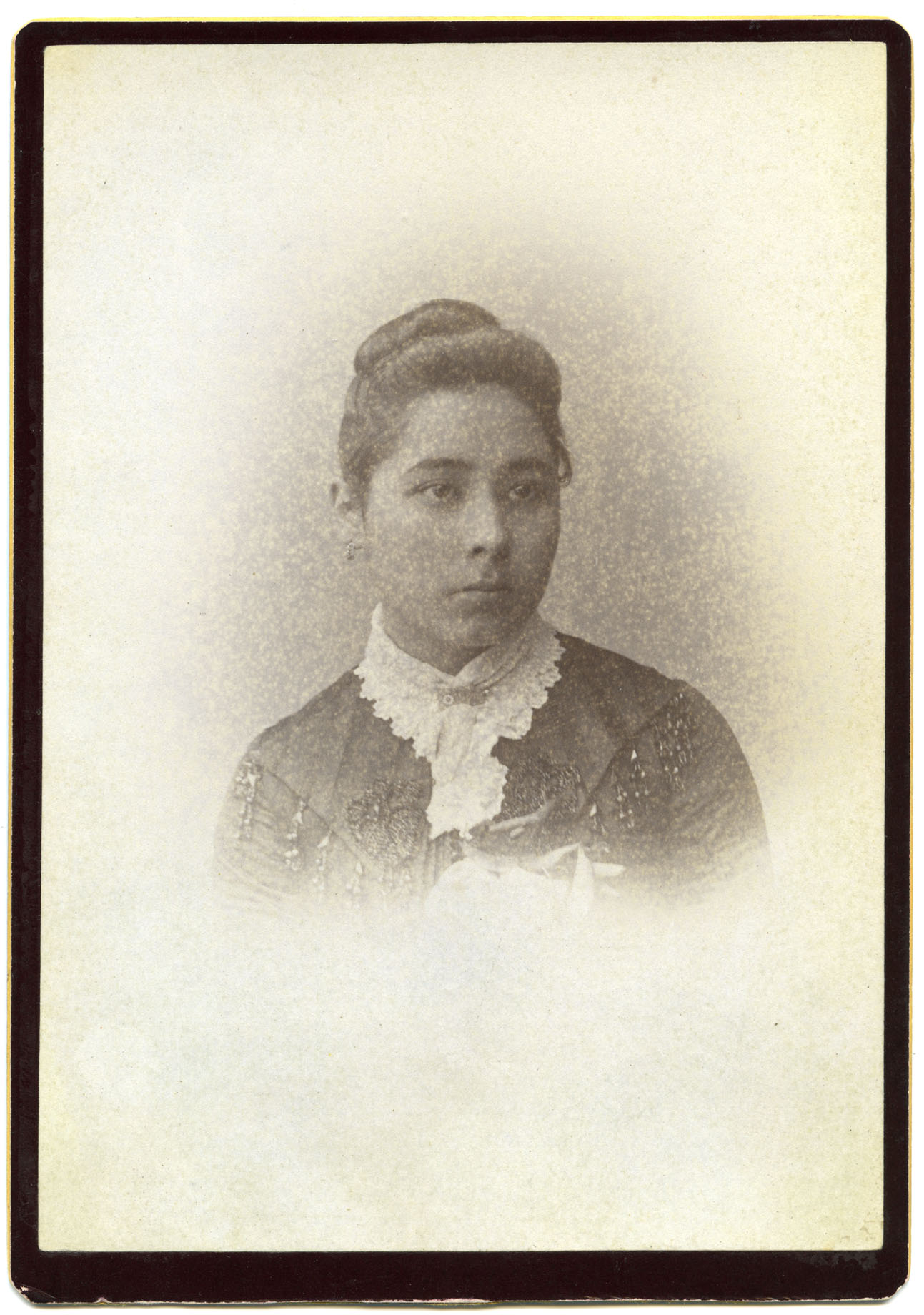 Portrait of Anna (or 'Annie') Pierre, a member of the Tututni tribe who came from the Siletz Agency. She attended the Indian Training School in Forest Grove and its successor, Chemawa School, from September 1884 through April 1889, according to the school's roster. For another portrait identified as Anna Pierre, see PUApic_008309. For an image of a relative who attended with her, Sarah Pierre, see PUApic_008377