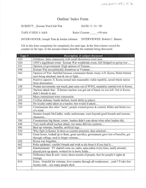 An audio recording of an oral history of Robert C. Barnes and Irene Barnes on the Korean War era in Hillsboro, Oregon including topics such as the politics of the Korean War, the United States' response to communism, and comparing the war to World War II and Vietnam. They talk about nuclear weapons, fear of nuclear attack and civil defense drills. They comment on Hitler, Stalin and Joseph McCarthy and discuss veterans, government help, and great sacrifices. They also touch on the polio epidemic.