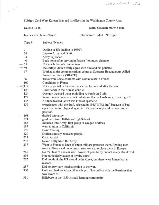 An audio recording of an oral history of Eldo L. Nofziger on the Cold War and Korean War and its effects in the Washington County area. Nofziger discusses his draft into the Army in 1950 in first group of Oregon draftees. He was a non-combat soldier, stationed in France at the communications center at Supreme Headquarters Allied Powers in Europe (SHAPE). Nofziger did not feel Communism was much of a threat to U.S. He mentions Senator McCarthy. He describes Hillsboro in 1950s as a small farming community.