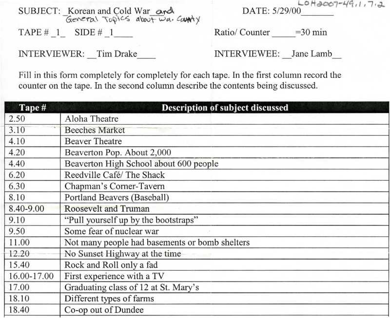 - An audio recording of an oral history of Jane Lamb on the Korean War. Lamb discusses life in the Beaverton area, mentions the Aloha Theater, Beeches Market, the Beaver Theater, Beaverton High School, Reedville Caf