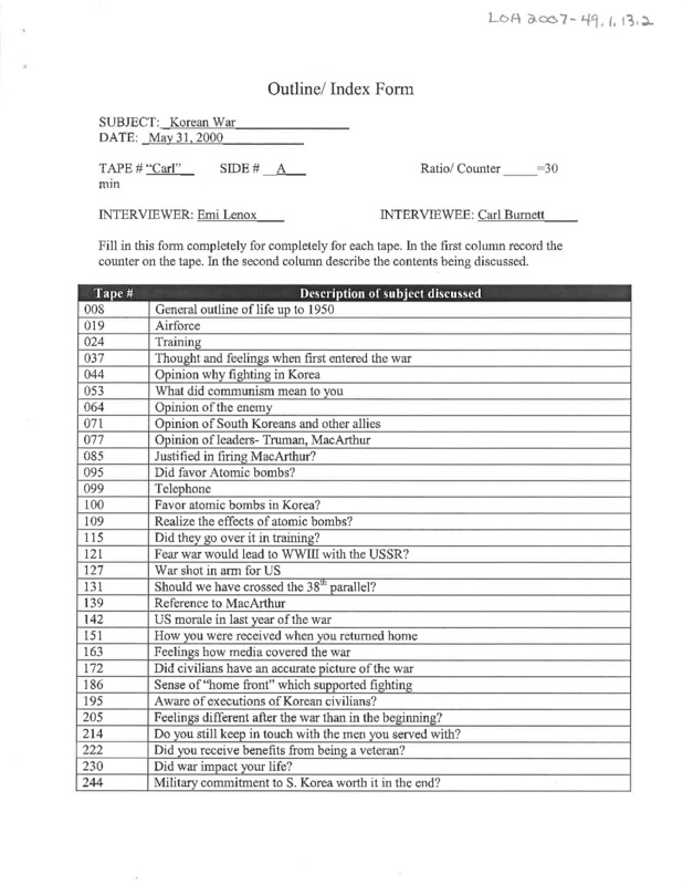 An audio recording of an oral history of Carl Burnett on the Korean War. Burnett talks about his experiences in the Air Force and the training he received; his feelings when he entered Korean War, his opinions about the enemy, South Koreans, Truman and MacArthur. He discusses the Atomic bomb and being stationed in Nevada in 1958 and witnessing the blast. He also made trips to Bikini Island.