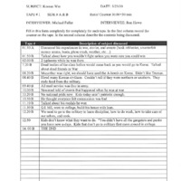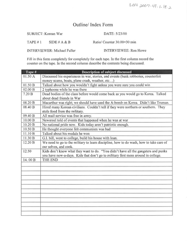 An audio recording of an oral history of Ron Howe on the Korean War. In this interview, Howe discusses his war experiences, stories, and friends who died. He won medals and went to college on the GI bill. Howe believes that kids today not as patriotic or disciplined.