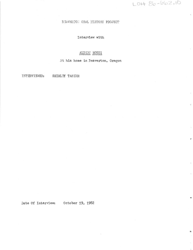 - An audio recording of an oral history of Albert Rossi. The original interview spanned two cassette tapes, but only the first tape has been found and digitized. There is a transcript of the full interview.