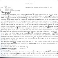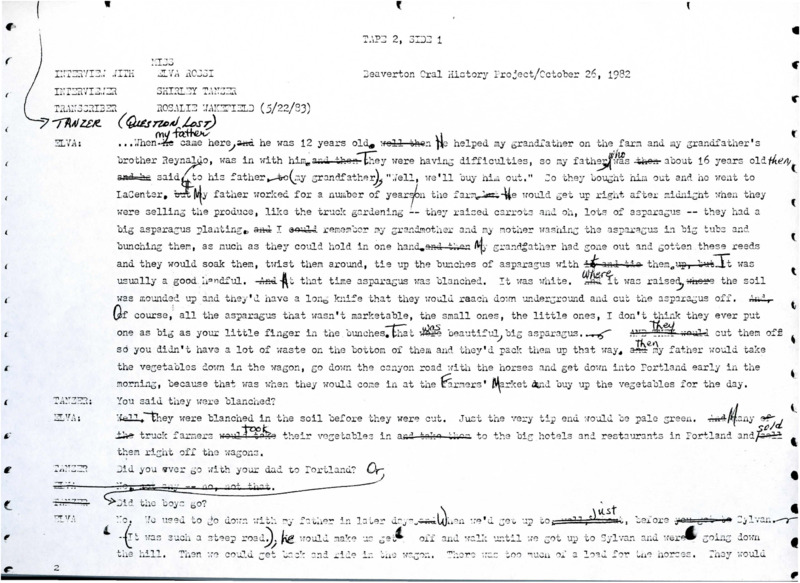 Part two of an audio recording of an oral history of Elva Rossi and her life in Beaverton, Oregon, recorded on October 26, 1982. Rossi continues with talking about growing crops on her dad’s farm and how he got them to Portland. She describes traveling by horse for about 2.5 hours to Portland to shop and the stores they stopped at. In 1900, her father left their farm and opened up a saloon that was very law abiding and kept until the Prohibition. Rossi attended Beaverton Grade School, Lincoln High School in Portland, and then Normal School to become a teacher. After teaching all of the grades in a one-room schoolhouse, Rossi left teaching to be a bookkeeper at Standard Oil company and then the Bank of California as a file clerk and in the analysis department. Rossi got married in 1935 but was divorced after only seven years. After her divorce, she was able to get a full time job again until she moved back to Portland to be with her sick mother. While living at home, she worked at Portland Trust in the analysis department. Rossi mentions the Columbus Day Storm, the Klu Klux Klan, and special holidays. From talking about family life with her grandparents to her friends in her youth and going to dances, Rossi describes life in Beaverton. A couple teachers Rossi talks about area Carl Fisher and Merle Davies who were both well liked in Oregon. The interview ends in the middle of a conversation. The voices are clearly audible throughout the recording. There is a full transcript attached with penciled-in corrections.