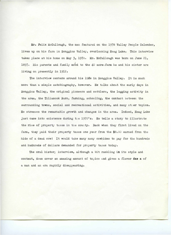 - An audio recording of an oral history of Felix McCullough, including the history of Scoggins Valley, logging, the Tillamook burn, neighboring farmers, and rapid changes in the valley. There is a transcript of this interview.