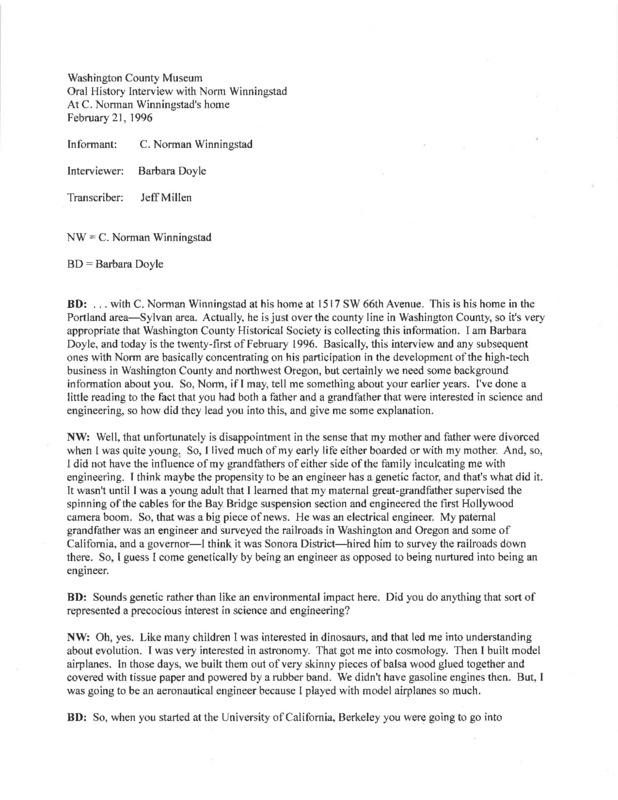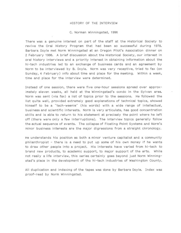 An audio recording of an oral history of C. Norman Winningstad about the developent of the high-tech business in Washington County, Oregon. There is a transcript of Part 1 of this interview, as well as the interviewer's summary and index.