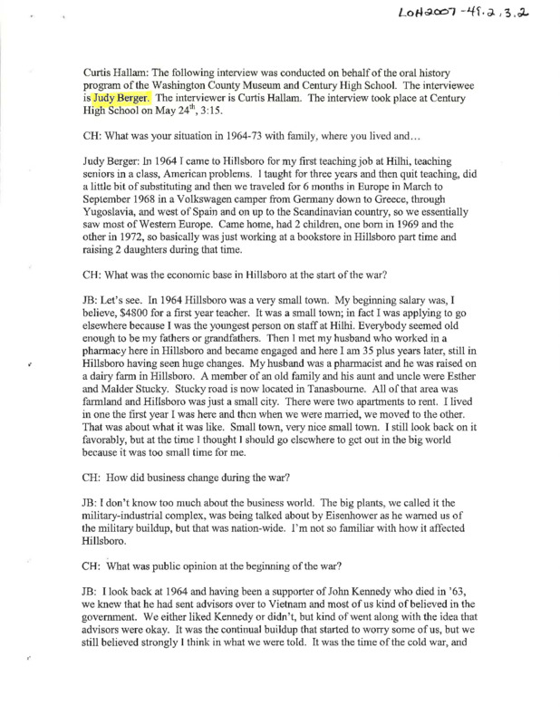 An audio recording of an oral history of Judy Berger on life in Hillsboro in the 1960s and during the Vietnam War. Berger talks about public opinion in Oregon starting to change when Oregon senators Wayne Morse and Mark Hatfield start to speak out. She mentions local anti-war demonstrations at Portland State and teacher Jack Kirkwood writing anti-war letters to the very conservative Hillsboro Argus and the Oregonian. Berger discusses propaganda from the John Birch Society and negative attitudes toward Jane Fonda. Traveling throughout Europe in 1968, Berger remembers a nationwide strike in France, Russia