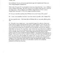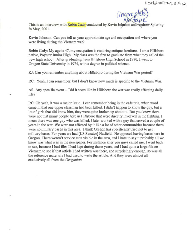 An audio recording of an oral history of Robin Cady recorded in May, 2001, on the Vietnam War and how it affected Hillsboro, Oregon. Cady, a native of Hillsboro, did not serve in the military, but wrote articles about the war. He describes the reactions to the war in Oregon, which was influenced by there not being military bases in Oregon and a senator who did not support the war. He talks extensively about how the Vietnam War became, for the US as a whole, a situation of “how to get out” versus the historical “how to win”. He talks about the importance of honor and how that impacted the way that the US dealt with the war. The war was eventually seen as a civil war between north and south Vietnam and the South Vietnamese would have to be the ones to win the war. The US involvement was seen as a police action to go in and help the south rather than try to win the war. Cady talks about a gentleman named Jack Kirkland, a teacher in the area who also wrote about the Vietnam War, and how their opinions differed. Cady comments on contemporary Vietnam and the effects the war had on it. He also talks about Ho Chi Minh and his involvement, the Asian democracies and admits that the US might have pushed western democracy too much, and how the war was a popular discussion of debate in schools in the US. He finishes by talking about the people who were brought into the draft were the poorer people who were not going to college. There were many ways to avoid entering the military during this time of war. There is a lot of white noise and background noise including a phone ringing, doorbell ringing, and people’s voices throughout the recording. There is a short transcript of the first couple of minutes of the recording.