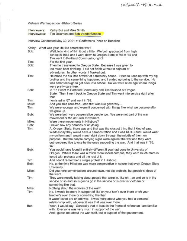 An audio recording of an oral history of Tom Delsman and Bob VanderZanden on the Vietnam era. Delsman was a student at Oregon State in 1966-1967 and was a member of the ROTC. He enlisted in 1967 and was sent to Vietnam in 1968. Delsman notes that Oregon State was pretty conservative and the University of Oregon was very liberal. Delsman and VanderZanden say that Hillsboro was fairly conservative and supported the government and people fighting in the war, though attitudes started to change between 1969 and 1970 and people wanted out of the war. They also mention the start of drug culture. There is a transcript of this interview.