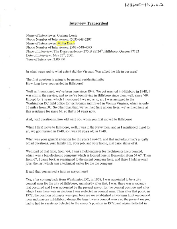 An audio recording of an oral history of Miller Duris (March 2, 1928 - March 23, 2014), an American politician in the state of Oregon, on life during the Vietnam War. Duris was 20 years old when he moved to Hillsboro in 1948 and was in the Navy. He worked for Tektronix Incorporated in Beaverton. He was a city councilman for Hillsboro in 1968, elected mayor in 1972 and served until 1976. He was a county commissioner in Washington County in 1977, became chairman of the board, then left in 1980. Duris says that Hillsboro was not very affected by the war and that the Hillsboro Argus newspaper did not do much editorializing about the war. Duris says he did not know of any draft-dodgers in Hillsboro and notes that the My Lai massacre turned many against the war. Duris, a World War two veteran, talks about how servicemen were not treated well when they returned home from Vietnam.