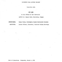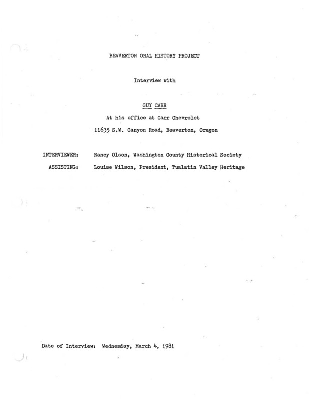 Part one of an audio recording of an oral history of Guy Carr about his life in Beaverton, Oregon, recorded on March 4, 1981. Carr was born in Colorado in 1900 and grew up in Virginia. After serving in the military during World War One, he moved to Beaverton in 1918 where his mom and stepdad owned Otto Ericson & Company, a Ford dealership, in Hillsboro and Forest Grove, Oregon. Carr details what Beaverton looked like when he first moved to the city and the farms and people that were around. Having learned to fly airplanes while in the military, Carr and some other men whom who he names, took part in building the Bernard Airport in about 1932. They also built airplanes and flew them around a bit. Carr mentions where some of those planes might have been located at the time of the recording. During the Depression, Carr was able to survive on his dealership businesses and he talks about how he bought and sold dealerships during this time also. During World War Two, there was an automobile shortage and Carr describes how he stayed afloat by working on cars but not selling them. He talks about the tire distributor in town called U.S. and Gates Rubber Company and how there was a large inventory of tires since the government had frozen the selling of tires. Carr involved himself in everything in town during the war to try to help people by being on City Council, the WPA making projects for people to build sidewalks, was chairman of the Water Committee to figure out the water system for Beaverton, was a volunteer fireman, and served as Acting Mayor a few times. Other topics that Carr talked about what the Oregon Electric Railway, the Multnomah Golf Club, the different highways between Hillsboro and Beaverton, the difference in being paid with warrants and scrips (a warrant drew interest, while the scrip was the face value), the Beaverton Airport, and the Premium Pictures Studio. Carr describes his antique car collection, how he was on “Faces and Places,” and talks about his health as what makes him rich rather than his money. The recording ends halfway through a conversation about Carr’s ancestry and his possible relation to Thomas Jefferson. There is a full transcript of the recording attached.