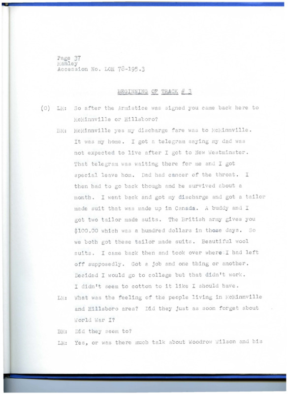 - An audio recording of an oral history of William (Bill) Manley, including early childhood in India, World War I and post-war activities. There is a transcript of this interview.