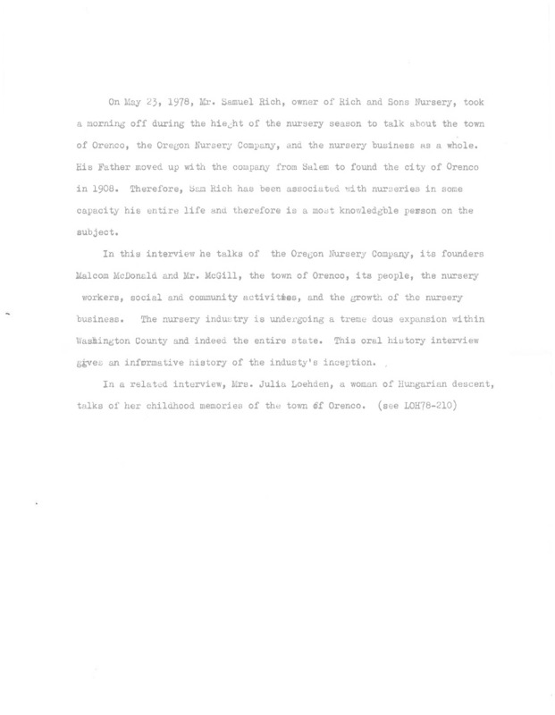 - An audio recording of an oral history of Samuel (Sam) Rich, covering the history of Orenco and the nursery business in Washington County. There is a transcript of this interview.
