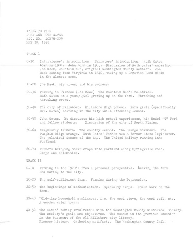 - An audio recording of an oral history of John and Ruth Gates on early farming in Hillsboro.