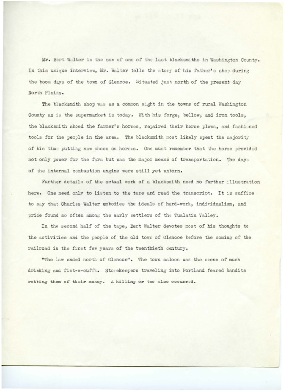 - An audio recording of an oral history of Bert Walter on the history of Glencoe and the blacksmith shop. There is a transcript of this interview.