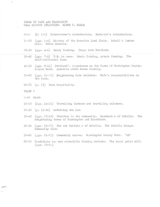 An audio recording of an oral history of Minor T. Hesse recorded on March 22, 1978, on the settlement and farming in Washington County, Oregon, specifically the Scholl area, during the nineteenth and twentieth centuries. His family represents the typical farmer in the area and his experiences convey common characteristics of rural life in the area. His family had come to Oregon with the intention to run a dairy farm and had to clear out the land of timber. He describes how his family made a profit from their cows and other products by making day trips into Portland. When bovine tuberculosis took out their herd of cows, Hesse recounts how his family invested in other crops, especially grains and potatoes to ship to California. He talks about his childhood chores on the farm, the Scholls Fair, the start of 4-H and the implementation of scientific farming, the addition of Ford automobiles and tractors to farm life, and the role that religion played in the area. Hesse describes the neighborhood trust that was built and how the farmers would help each other out, catch scammers and bring them into the town sheriff, and the expectation behind letting strangers stay at their farmhouse as they were traveling. He finishes by talking about the hops industry in the area, the breweries in Portland, the Chinese and Mexican migrant workers that came to help in the fields and stayed in labor camps set up by the farmers, and how Prohibition affected the hops business. There is a full typed transcript of the interview with an index, list of questions, and an introduction.
