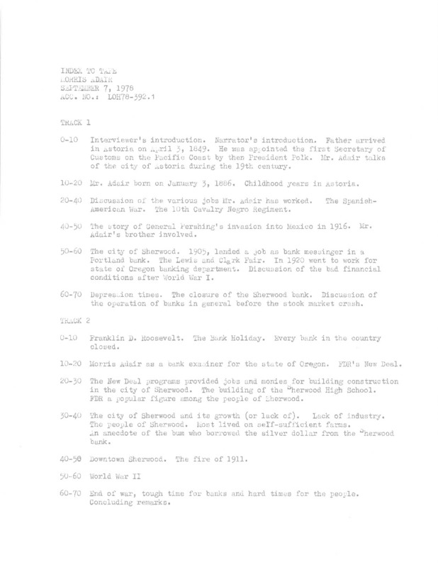 An audio recording of an oral history of Morris Adair recorded on September 7, 1978, about his life in Washington County, Oregon. The recording describes his childhood on a farm in Astoria, Oregon, and his father having the first cream separator in Oregon. He talks about the thoughts and emotions in Washington County about the Spanish-American War, describes details of the war including the death of his brother, and tells of a song that was sung during the Civil War and the Spanish-American War. In the second half of the recording, he talks about his experience working in a bank in Sherwood, Oregon, through the Great Depression. He describes the role of banks in the beginning of the twentieth century, the role he played as an examiner of banks, the Columbia Region Association of Governments and how it played a part in adding land to the area, a terrible fire in Sherwood in 1911, and then the return of men to the farm from war and how their ignorance of farming fed into the Depression. The recording is very hard to hear. There is a full transcript with an introduction, index, and handwritten notes of the questions asked in the interview.