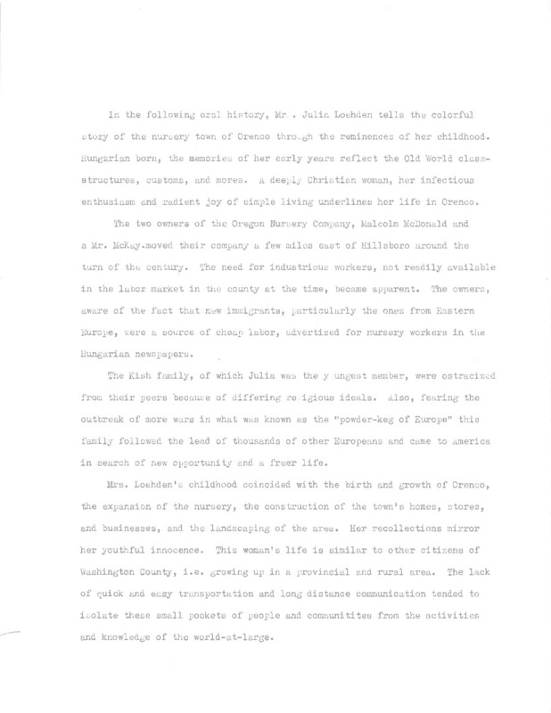 - An audio recording of an oral history of Julia Loehden on the Hungarian community in Orenco. There is a transcript of this interview.