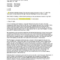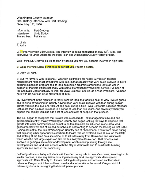 An audio recording of an oral history of Bert Gredvig, including Tektronix, land use and facilities. Gredvig was with Tektronics for almost 23 years, mostly in facilities management roles. He talks about his experiences working there. There is a transcript of this interview.