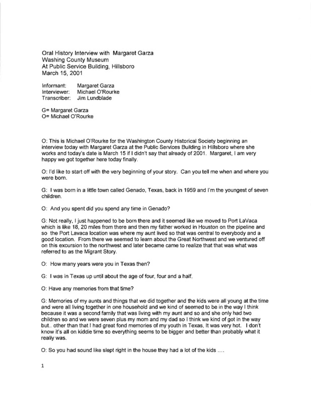 - An audio recording of an oral history of Margaret Garza, including migrant childhood, growing up in Hillsboro,and Virginia Garcia Clinic. There is a transcript of this interview.