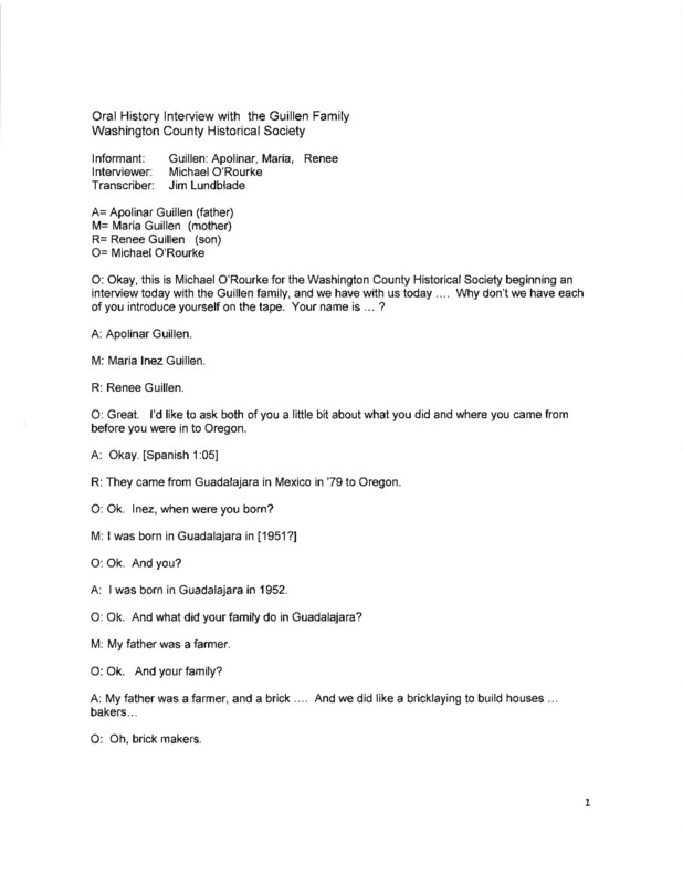 An audio recording of an oral history of Maria Inez Apolinar and Renee Guillen, including migrating from California, and a popular Mariachi band in the area. The original interview spanned two cassette tapes, but only one has been found and digitized. Physical file includes finding aid. There is a transcript of the full interview.