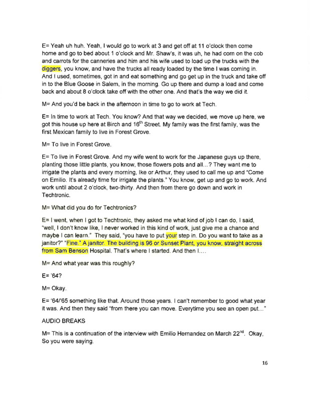 - An audio recording of an oral history of Emilio Hernandez, including being born in Texas, life in the army, coming to the county, and Forest Grove. There is a partial transcript of this interview.