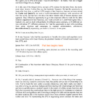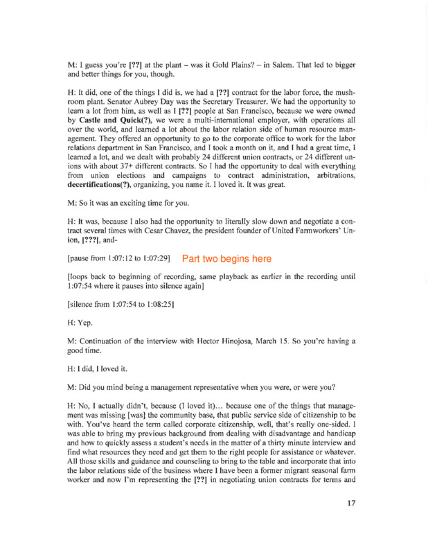 An audio recording of an oral history of Hector Hinojosa, including being from Matamoros, Mexico, coming to the U.S. as migrant, and founding Centro Cultural. Physical file includes resume. There is a transcript of this interview.