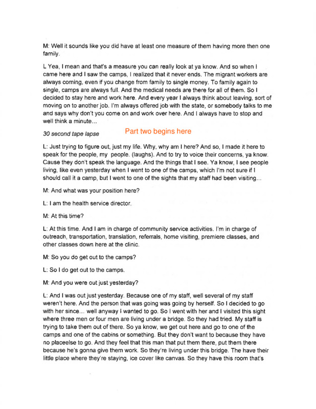 An audio recording of an oral history of Maria Loredo, including her father being a bracero, coming to county as migrant in 1966, description of harsh weather conditions, and the Virginia Garcia Clinic. There is a transcript of this interview.