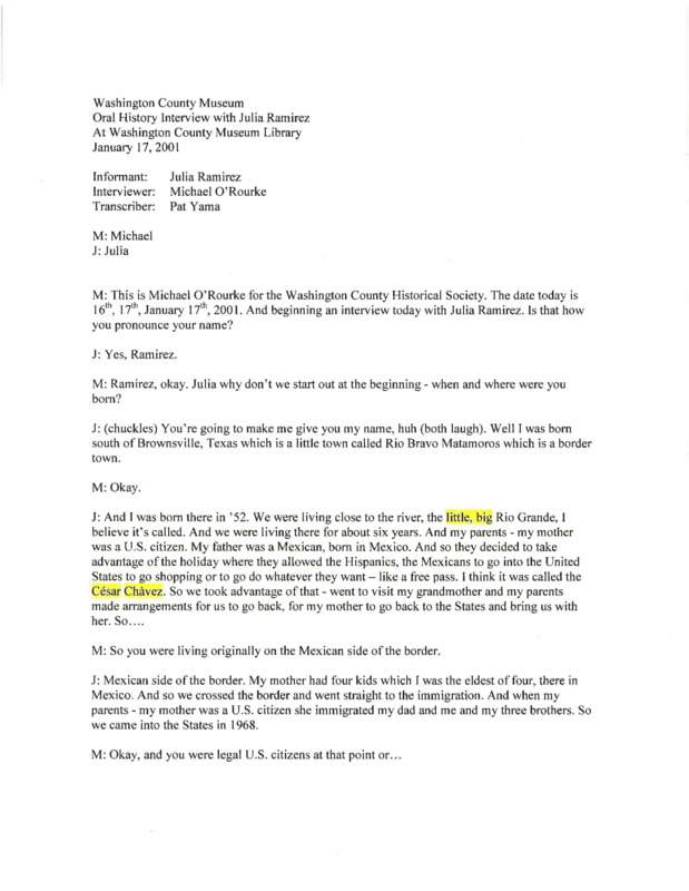 An audio recording of an oral history of Julia Ramirez, including migrant life as a child, citizenship, choosing to live in rural Cornelius, and her taco truck business. File includes finding aid. There is a transcript of this interview.