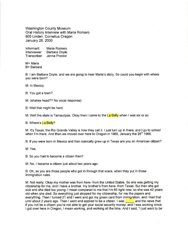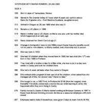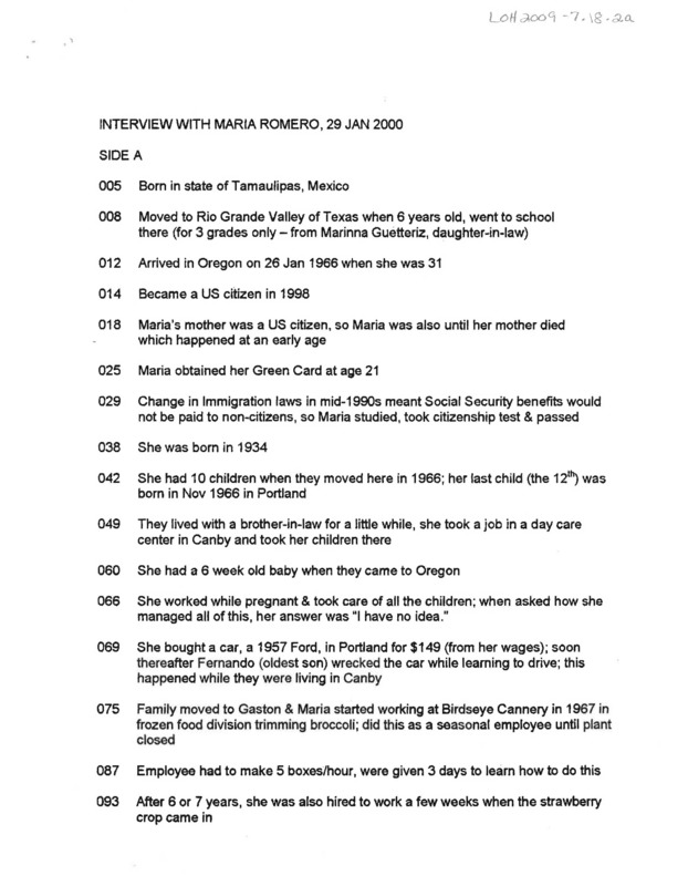 - An audio recording of an oral history of Maria Romero, including childhood in Mexico, life in Texas, work at Bird's Eye Cannery, and disussion of the formation of Centro Cultural. There is an index and a transcript of this interview.